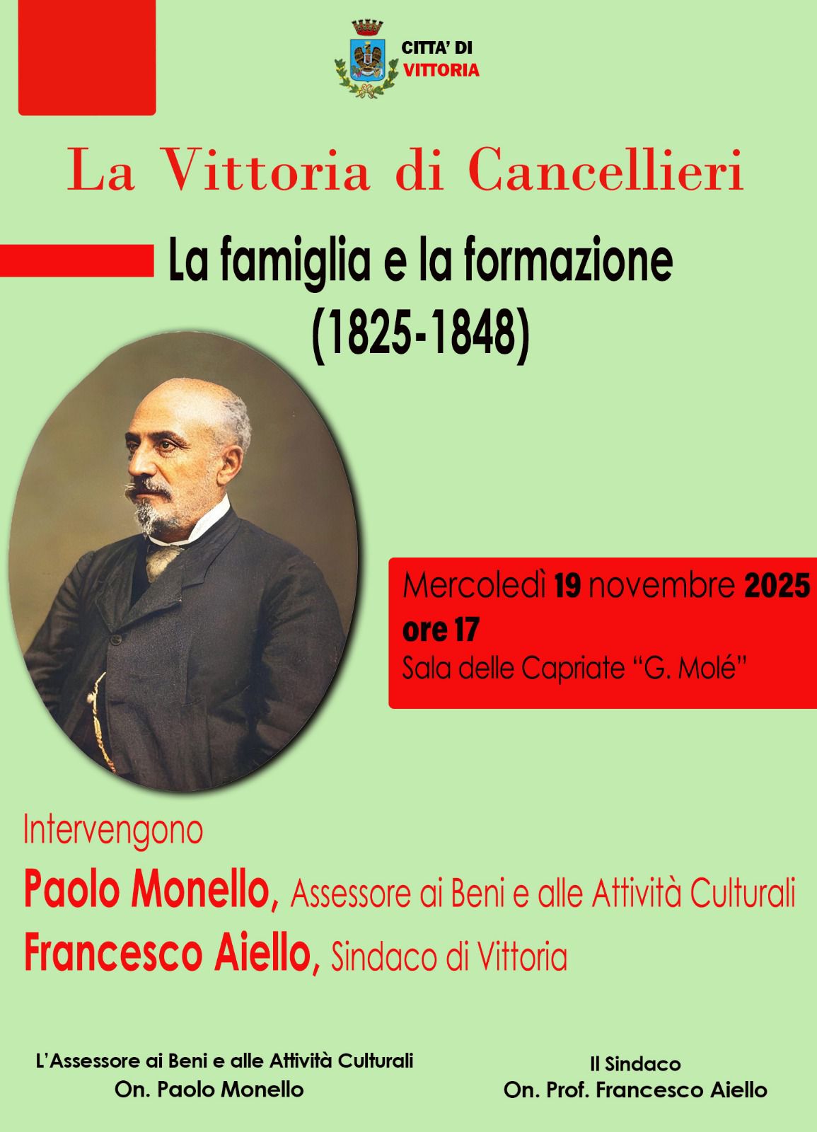 L’Amministrazione comunale della Città di Vittoria informa che Mercoledì 19 Novembre 2025, alle ore 17, presso la Sala delle Capriate “G. Molé”, si terrà la conferenza dal titolo “La Vittoria di Cancellieri – La famiglia e la formazione (1825-1848)”.
