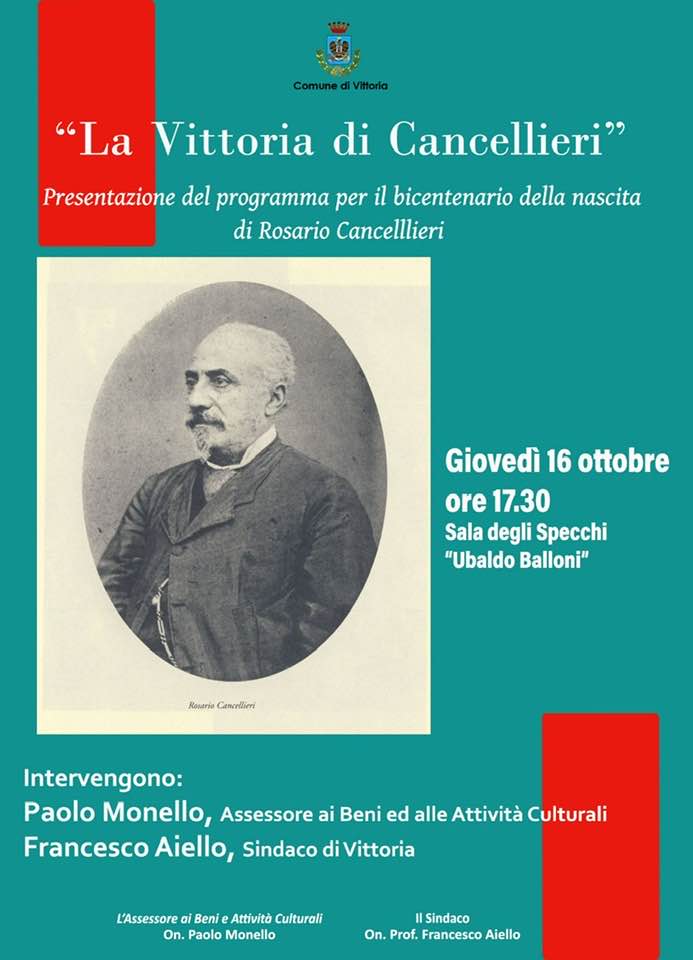Giovedì 16 Ottobre, con inizio alle 17,30, nella Sala degli Specchi "Ubaldo Balloni" di Palazzo Iacono, Via Bixio 34, sarà presentato il programma dell'Amministrazione Comunale in occasione del bicentenario di Rosario Cancellieri "La Vittoria di Cancellieri".