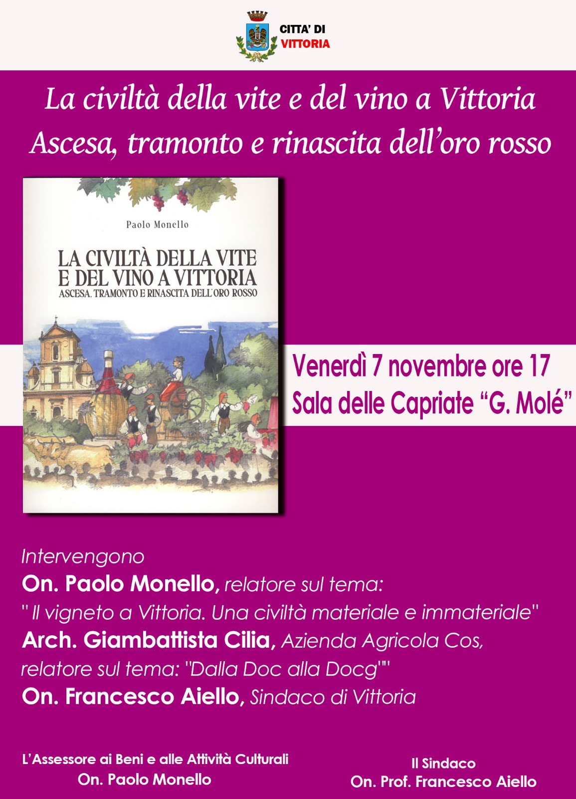 Durante l’incontro sarà presentato il volume di Paolo Monello, “La civiltà della vite e del vino. Ascesa, tramonto e rinascita dell’oro rosso”, un’opera che racconta la straordinaria evoluzione economica, sociale e culturale legata alla coltivazione della vite e alla produzione vinicola nel territorio di Vittoria.