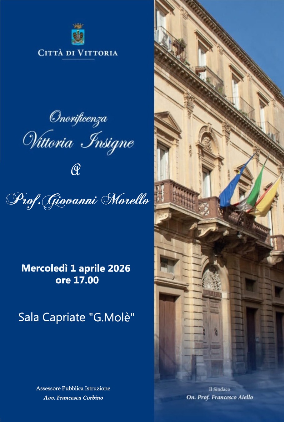 Mercoledì 1 aprile, alle ore 17.00, presso la Sala delle Capriate “Gianni Molè”, si terrà la cerimonia di conferimento dell’onorificenza “Vittoria Insigne” al Prof. Giovanni Morello.