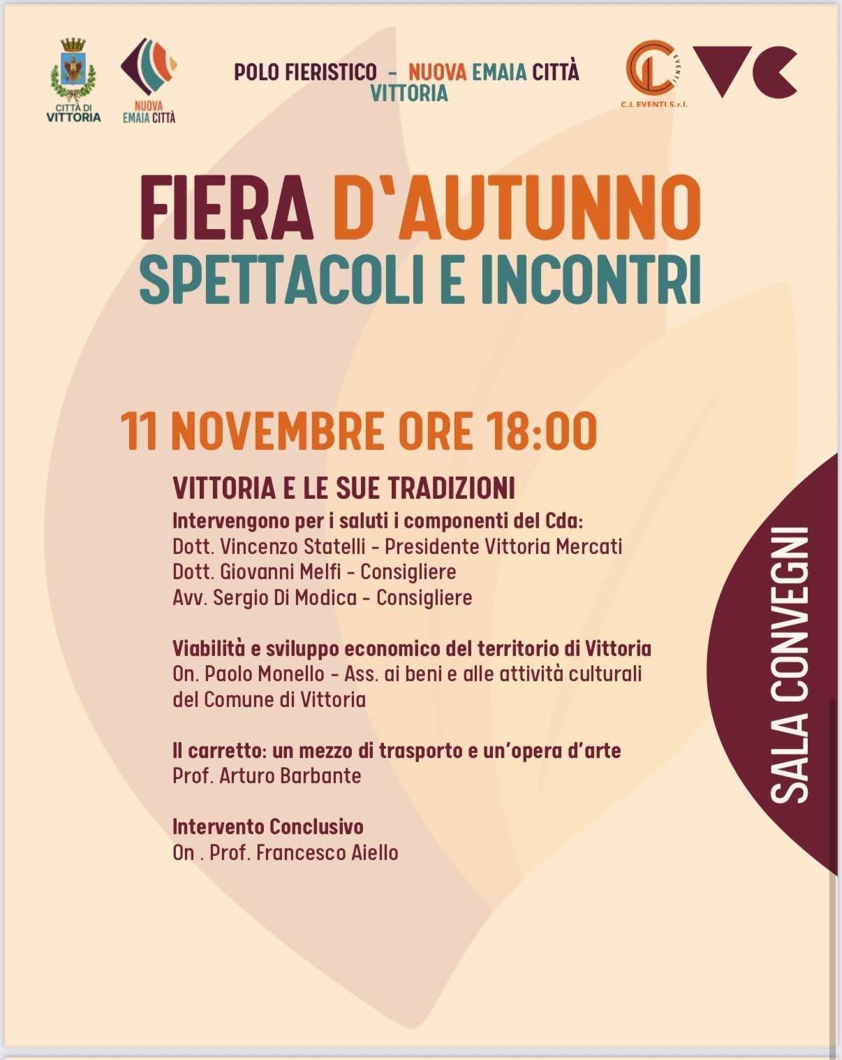 Martedì 11 novembre alle ore 18:00, presso la Sala Convegni del Polo Fieristico Nuova Emaia Città, si terrà l’iniziativa culturale “Vittoria e le sue tradizioni”, appuntamento inserito nel programma della Fiera d’Autunno – Spettacoli e Incontri, promossa dal Comune di Vittoria in collaborazione con Nuova Emaia Città.